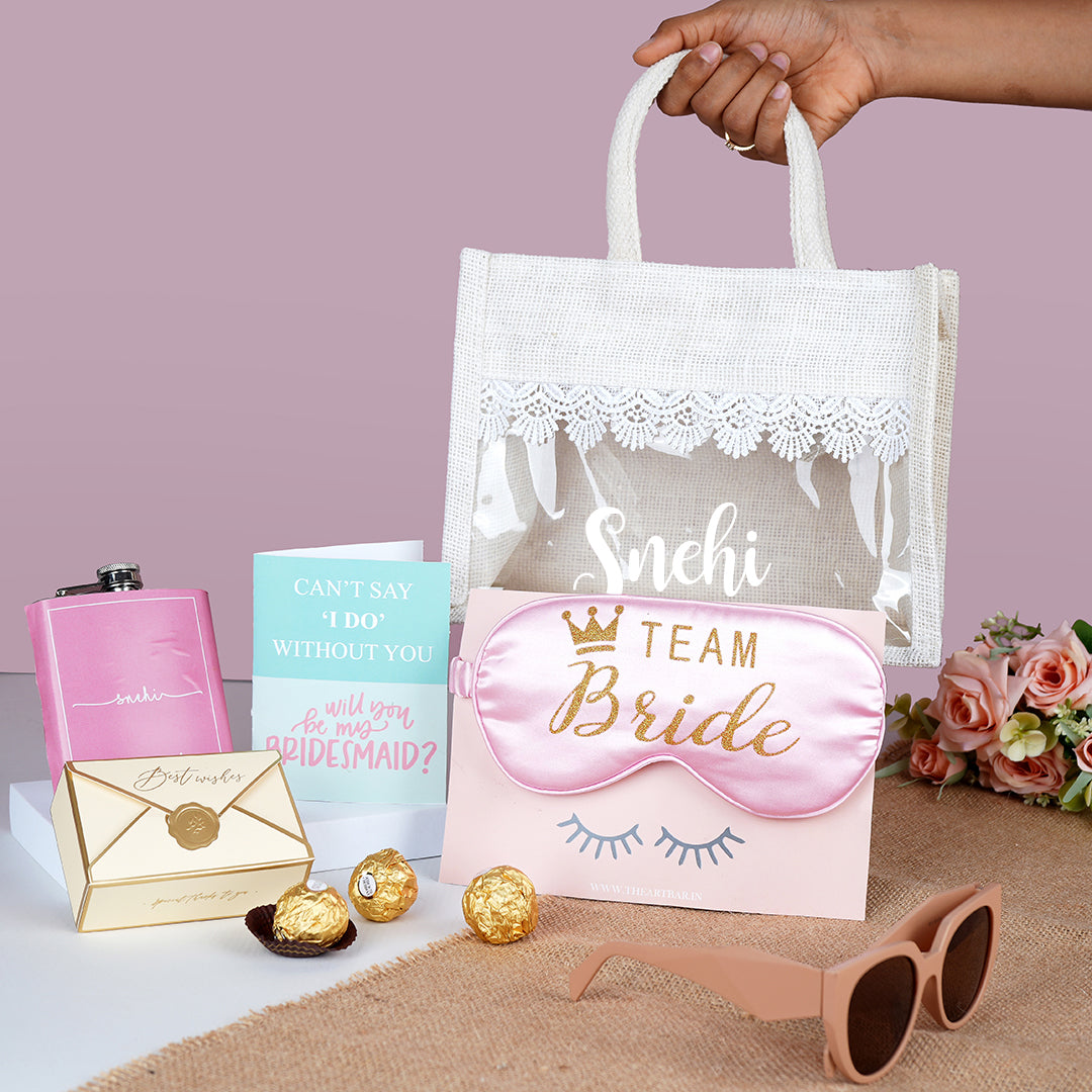 Celebrate the special bond between the bride and her closest friends with our Bridesmaid Hamper. This carefully curated gift set is designed to show appreciation for the amazing women standing by her side on her big day. Each item is personalized to make your bridesmaids feel extra special, comfortable, and pampered as they prepare for the wedding.