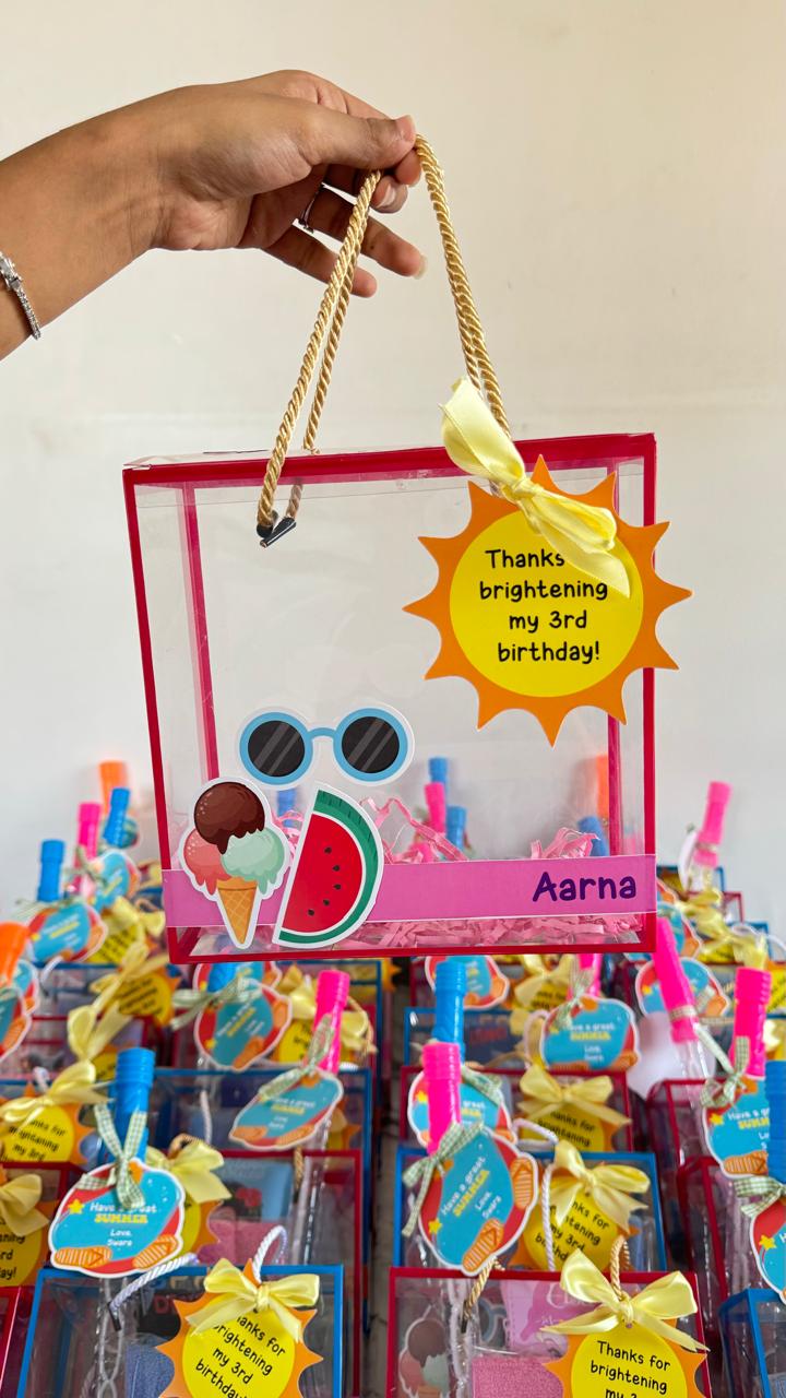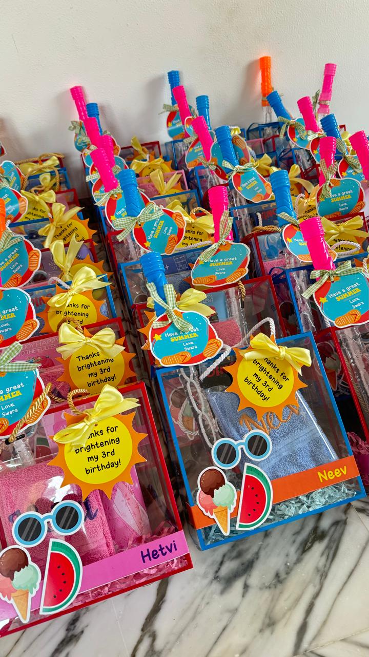 Our Summer Boxes are the perfect seasonal treat for kids — packed with cool, custom goodies to keep the vibes high! Each box includes a bubble bottle, a personalized hand napkin, and a cute pouch — all bundled together to make the ultimate sunny day surprise.